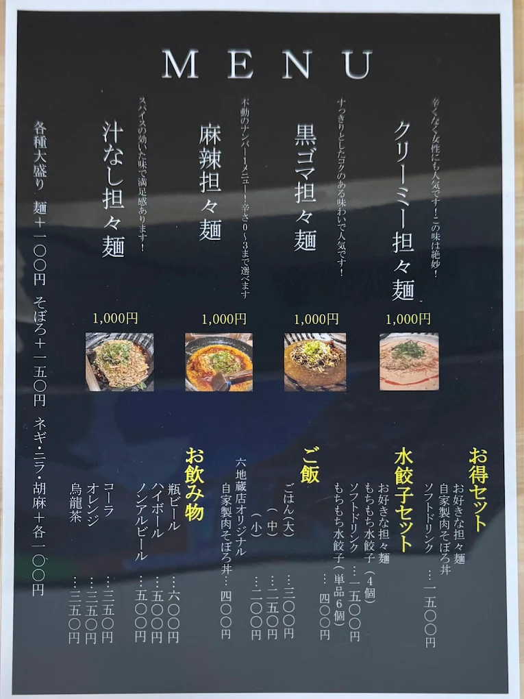 担々麺は4種類あり、どれも1,000円と分かりやすい価格設定です。